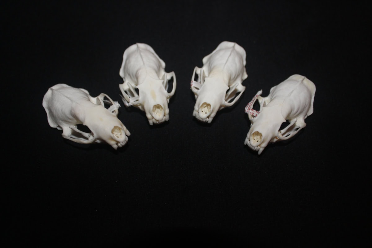These 4 skulls have been beetled, mostly degreased, and then whitened. They are considered craft grade because most of them have chipped, worn, or missing teeth. The bottom jaw is tied to the skull with monofilament and is easily removable. These skulls have not been sealed, so they are perfect for painting, carving, burning, jewelry, or any other craft activities.